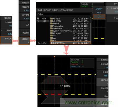當(dāng)原始波形沒(méi)辦法滿(mǎn)足我們對(duì)波形的限制時(shí),用戶(hù)還可將儀器內(nèi)部Flash存儲(chǔ)器或外部U盤(pán)中存儲(chǔ)的測(cè)試模板文件導(dǎo)入,導(dǎo)入的波形可以是以前保存的*.msk文件或者是自行設(shè)置的*.txt文件。