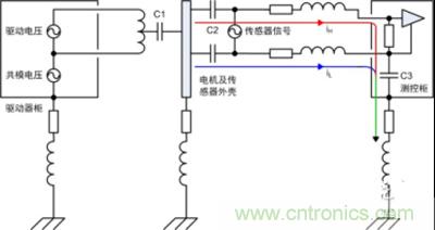 4)此處電機平臺和測控柜已有接地,通過傳感器連接線屏蔽層又將兩者連接,形成地環路。然而實際工程應用中地環路往往不可避免地存在,本例中若沒有屏蔽層依然會通過C2、電纜和C3產生高頻地環路,從這方面看屏蔽層改變了環路路徑。