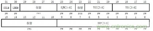 簡單的了解了CAN總線位時間的分段后,我們來看看一個節(jié)點的波特率到底要如何設置。如圖2是某ARM內核的CAN位時間特性寄存器 (CAN_BTR)。