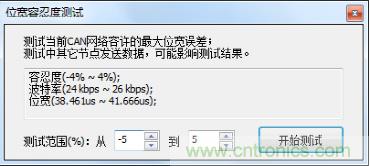 l位寬容忍度測試:采用CANScope對當前波特率下CAN卡進行位寬容忍度測試,測試其對波特率的容忍度情況,測試結果為24kbps~26kbps,容忍度情況較好;