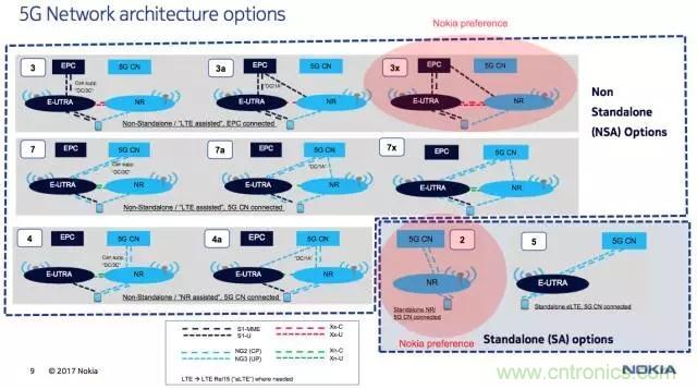 對(duì)于5G組網(wǎng),3GPP在去年釜山會(huì)議上由德國(guó)電信提出了12種組網(wǎng)選項(xiàng)。其中選項(xiàng)3/3a/3x、7/7a/7x、4/4a為非獨(dú)立組網(wǎng)構(gòu)架,選項(xiàng)2、5為獨(dú)立組網(wǎng)構(gòu)架。