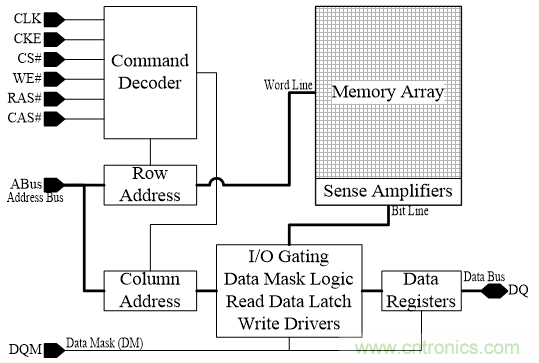 圖1顯示SDRAM的簡要功能方塊圖,行地址選通信號(CAS#)是根據(jù)預(yù)充電而設(shè)計(jì)的延遲控制信號,亦即無預(yù)充電則不必分時(shí)控制列地址選通信號(RAS#)、CAS#。差動(dòng)頻率信號(CLK, CKE)的頻率是基于微處理器的工作頻率,數(shù)據(jù)屏蔽信號(DQM)對應(yīng)差動(dòng)頻率信號的邊緣;這些信號用于進(jìn)行同步傳輸操作。對于感測放大器以及寫入驅(qū)動(dòng)器的配置規(guī)劃,通常根據(jù)外部數(shù)據(jù)總線的位寬度而設(shè)計(jì)相同的數(shù)量,然而,可以導(dǎo)入并行存取的方法來增加存取效率,因此增加了行地址的位寬度以選擇同列不同行的感測放大器與寫入驅(qū)動(dòng)器。這種方法產(chǎn)生了叢發(fā)模式(burst mode)以及同列存取,但并不會增加訪問速度,并且還要進(jìn)行同步傳輸操作,所以需要數(shù)據(jù)緩存器。