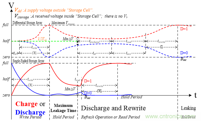 如果說3T DRAM是第一代DRAM技術(shù),使用差動(dòng)放大器實(shí)現(xiàn)讀取功能的1T DRAM是第二代DRAM,那么在本文中的第三代DRAM技術(shù)是指取代差動(dòng)放大器且大幅提升讀取功能的存取技術(shù)。1T DRAM的內(nèi)存基本單位是由一晶體管和一電容器所組成的儲存單元,又稱為1T DRAM單元。圖3顯示在單一儲存單元上進(jìn)行存取操作的波形,上半部分是使用差動(dòng)放大器的第二代技術(shù),下半部分是第三代技術(shù),此圖主要用于比較這二者完成讀取操作所需花費(fèi)的最長時(shí)間。當(dāng)這一電容器的儲存電壓(Vstorage)放電達(dá)到最小差異電壓(Min. ?V)時(shí)就必須立即進(jìn)行更新操作(即讀取),所以此圖呈現(xiàn)有關(guān)讀取操作的最長時(shí)間就等于是更新操作的最長時(shí)間。圖中標(biāo)示有tprecharge、tread、trewrite、twrite,這些技術(shù)用語依序?qū)?yīng)產(chǎn)品規(guī)格的tRP、tRCD、CL與CWL。第三代技術(shù)無需tRP,除此之外,tRCD也很短暫且可由CWL替換CL,因此訪問速度接近SRAM,存取效率低于SRAM。