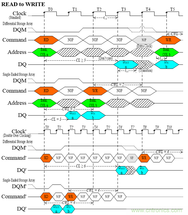 圖4用于觀察SDRAM的命令序列對于不同存取技術(shù)所發(fā)生的變化,此圖用于比較第二代與第三代技術(shù)之間的存取效率。SDRAM的命令序列有多種組合,其中讀取命令至寫入命令(READ to WRITE)最能突顯不同存取技術(shù)之間的差異。第三代技術(shù)的讀取時(shí)間(tread)很短,于是CL值可以很小,但受到差動(dòng)頻率信號以及DQM信號的限制而不能等于0;另外,即使CL值等于1也還有回寫時(shí)間(trewrite),所以第三代技術(shù)要以CWL值來替換CL值。