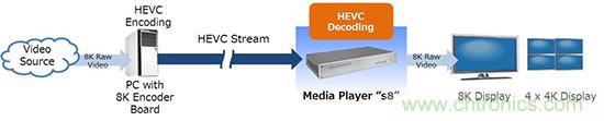索喜科技通過搭載4枚LSI“MB86M31”組成8K HEVC實時編碼系統,配合媒體播放器s8,完成8K影像編碼、發送、解碼、顯示所有必須的影像處理,為8K影像發送提供整體解決方案。