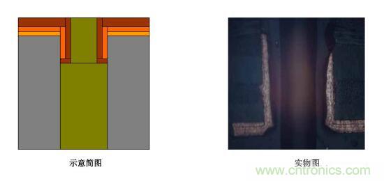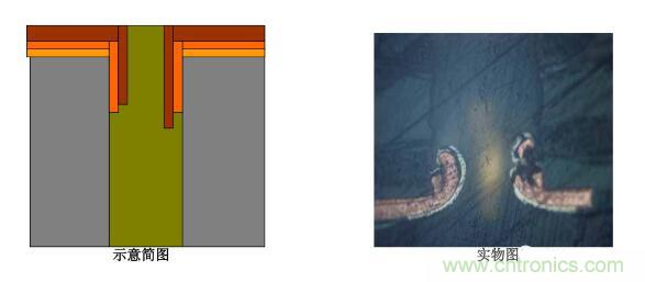 (2)孔內(nèi)板電銅薄孔無銅―――表銅板電層均勻正常,孔內(nèi)板電層從孔口至斷口處呈遞減拉尖趨勢(shì),且斷口處一般處于孔的中間部位,斷口處銅層左