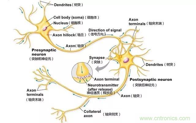 人腦神經元在接受到刺激后,其細胞膜內外帶電離子分布將發生變化,因而形成電位差,電位差將沿著神經細胞軸突、樹突雙向傳導,形成脈沖電流。而當該電信號傳遞到突觸時,突觸前神經元將釋放神經遞質(如多巴胺、腎上腺素)由突觸后神經元接受神經遞質產生興奮(該過程單向傳遞),并向下傳遞作用與人體反應器并發生反應。