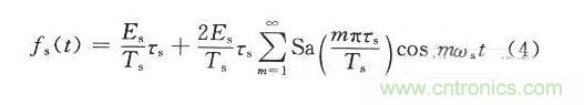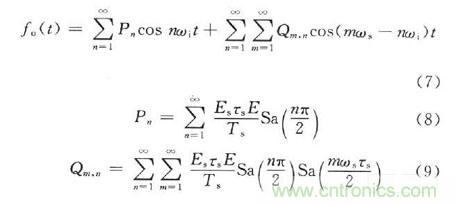 式中:E,ωi分別為輸入信號(hào)的幅度和角頻率。設(shè)采樣脈沖信號(hào)為fs(t),采樣后的信號(hào)為fo(t),則采樣過(guò)程在時(shí)域上的數(shù)學(xué)表示式為fo(t)=fi(t)fs(t),在DRFM中采用等間隔均勻采樣,采樣周期為T(mén)s,采樣時(shí)鐘頻率ωs=2πfs。在實(shí)際電路中,采樣是在采樣脈沖上升的瞬間完成的。因此采樣脈沖的寬度可以看成一個(gè)窄脈寬,用τs。來(lái)表示。采樣脈沖的傅里葉級(jí)數(shù)為: