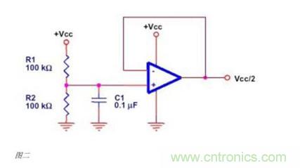 單電源工作的運放需要外部提供一個虛地,通常情況下,這個電壓是VCC/2,圖二的電路可以用來產(chǎn)生VCC/2的電壓,但是他會降低系統(tǒng)的低頻特性。