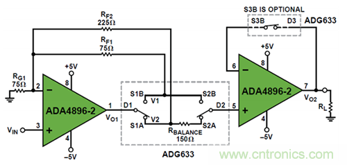 圖 1. 利用 ADA4896-2 和 ADG633 構(gòu)建低噪聲增益可選放大器來驅(qū)動低阻負載