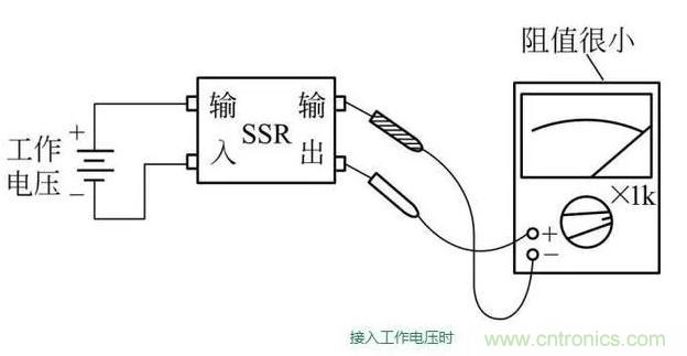在上一步檢測的基礎上,給固態繼電器輸入端接入規定的工作電壓,這時固態繼電器輸出端兩引腳之間應該導通,萬用表表針指示阻值很小。