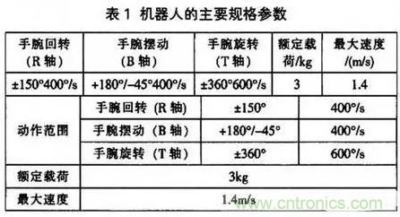 確定了空間結(jié)構(gòu)和手腕結(jié)構(gòu)后,可確定手腕回轉(zhuǎn)、手腕擺動(dòng)及手腕旋轉(zhuǎn)三個(gè)姿態(tài)的自由度。其參數(shù)見表l (參數(shù)來(lái)于SSA2000工業(yè)機(jī)器人)。