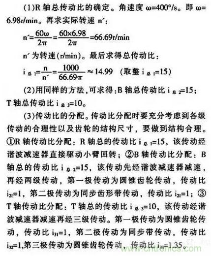 諧波齒輪減速器是一種新型的機(jī)械傳動(dòng)變速機(jī)構(gòu)。 與普通齒輪傳動(dòng)相比,具有體積小,重量輕,結(jié)構(gòu)簡(jiǎn)單。它與傳動(dòng)比相當(dāng)?shù)钠胀p速器比較,其零件減少50%。 體積和重量均減少l,3左右或更多。傳動(dòng)比范圍大(單級(jí)傳動(dòng)比為40~350,多級(jí)傳動(dòng)比可達(dá)1600~100000),傳動(dòng)效率高(單級(jí)傳動(dòng)效率饑≥85%),傳動(dòng)精度高。承載能力強(qiáng)等特點(diǎn)。 根據(jù)所選擇的電機(jī),選擇型號(hào)為SGMAH—OIA,額定功率為loo W,額定轉(zhuǎn)矩為0.318 N·m,額定轉(zhuǎn)速為 3000 drain的交流伺服電動(dòng)機(jī)。同時(shí)選擇XBl諧波減速機(jī),機(jī)型為25,減速比為40,輸出力矩為1.0N·m,輸入轉(zhuǎn)速為3000 r/min。為了訂貨和維修方便,三軸均采用同一種減速器。