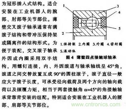 球軸承是機(jī)器人和機(jī)械手機(jī)構(gòu)中最常用的軸承。它能承受徑向和軸向載荷,摩擦較小。其機(jī)器人專用軸承四點(diǎn)接觸式設(shè)計(jì)以及高精度加工。這種軸承比同等軸徑的常規(guī)中系列四點(diǎn)接觸軸承輕25倍。它的內(nèi)圈(或外圈)由兩個(gè)半圈精確拼配而成,而其整體外圍(或內(nèi)圈) 的溝曲率半徑較小,使鋼球與內(nèi)、外圈在四個(gè)“點(diǎn)”上接觸。既加大了徑向負(fù)荷能力,又能以緊湊的尺寸承受很的兩個(gè)方向的軸向負(fù)荷,并且有很好的兩個(gè)方向的軸向限位能力,因?yàn)樗妮S向游隙相對(duì)較小。而其接觸角 (一般取為35)又較大。工業(yè)機(jī)器人專用薄壁四點(diǎn)接觸球軸承通常有帶密封圈和不帶密封圈的結(jié)構(gòu)形式(見圖4)。其主要由內(nèi)圈、外 圍、保持架、鋼球或非接觸式密封圈組成。內(nèi)、外圈均為整體結(jié)構(gòu)。鋼球與內(nèi)、外因溝道呈四點(diǎn)接觸.保持架為冠形插入式結(jié)構(gòu)。