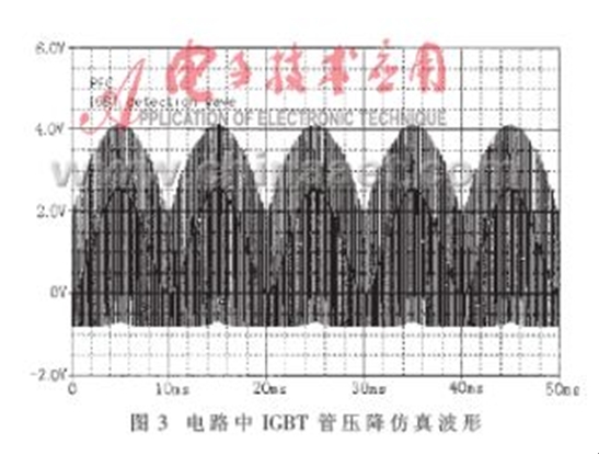 當圖1所示的PWM變換器工作在單相高頻整流模式下,應用PSPICE仿真軟件對圖2所示的電路進行仿真研究,可以得到如圖3所示的結果。圖3所示的仿真波形相當于在圖2電路中IC5B的第7腳觀察到的信號波形。仿真結果表明,檢測電路可以快速、有效地將PWM變換器的下管導通時的管壓降檢測出來。圖4所示波形是實際電路工作時檢測到的相關波形。圖中,1#通道顯示的是單相高頻整流電感電流的給定波形,2#通道顯示的是實際檢測到的圖2電路中IC5B的第7腳的工作波形。比較圖3和圖4可以得出,該檢測電路可以快速、有效地檢測出IGBT導通時的管壓降,從而對IGBT實施有效的保護。