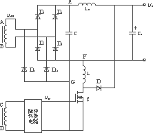 1)t1-t2時段 uAB處于高毛刺階段,毛刺最大值比正常值Uo高出ΔU,這時由D1,D2,D11,D12形成全橋整流電路,對C充電,具體講是D1和D12導(dǎo)通,uAB的毛刺部分將被C所吸收,使uc=Uo+ΔU。顯然,C越大,ΔU越小;毛刺越高,ΔU越大。