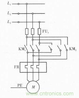 在眾多的操作系統(tǒng)中均要求電動機能夠?qū)崿F(xiàn)正反轉(zhuǎn)給操作,從電動機的工做原理中可知,需將三相電源中的任意兩個進行對調(diào),就能實現(xiàn)電動機的反向運轉(zhuǎn),因此電動機實現(xiàn)正反轉(zhuǎn)的實質(zhì)便是電源進線的調(diào)換。但若僅調(diào)換進線,容易導致電源短路,因此必須設(shè)置互鎖,圖2是三相異步電動機正反轉(zhuǎn)的原理設(shè)計圖,圖中KM1和KM2均是交流接觸器主觸頭,當KM1吸合時,KM2交流接觸器主觸頭就會斷開,然后便可實現(xiàn)電機的正轉(zhuǎn)。若是斷開交流接觸器主觸頭KM1,KM2就會吸合,此時電動機則會實現(xiàn)反轉(zhuǎn),圖中的FU1主要用于防止電源短路,圓形代表電機M。