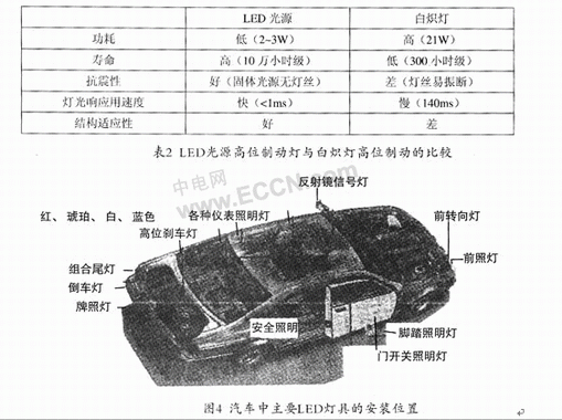 LED在汽車中的應用非常廣泛,除車頭前照燈外,其它一些車外和車內燈、照明與信號燈、高照度與低照度燈均可采用LED光源,如圖4所示。