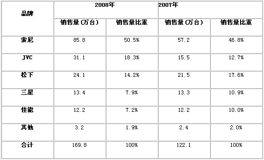 表2 2007-2008年中國數(shù)碼攝像機(jī)市場品牌銷售量結(jié)構(gòu)