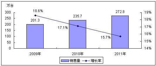 賽迪顧問預(yù)計(jì),2009年中國數(shù)碼攝像機(jī)市場銷售量將達(dá)到201.3萬臺,同比增長18.6%,到2011年數(shù)碼攝像機(jī)銷售量將達(dá)到272.8萬臺,2009-2011年中國數(shù)碼攝像機(jī)市場銷量年均復(fù)合增長率達(dá)到17.1%。