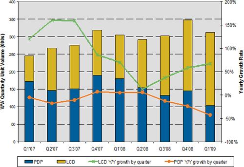 圖一 Q1’09全球26寸及以上尺寸公眾顯示器出貨量與成長率 - 按液晶與等離子顯示器區分