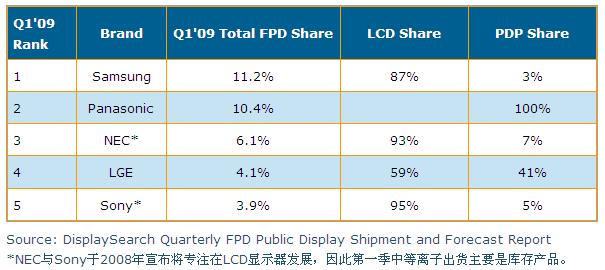 有部分品牌廠商在2008年停止采用等離子面板做為公眾顯示系統應用,對于等離子陣營造成了一些傷害;不過主要等離子廠商如Panasonic仍是非常專注于等離子面板于公眾顯示領域的應用,我們相信這些主要廠商的投入,對于等離子未來在公眾顯示領域的發展仍會有一定影響力。根據DisplaySearch第一季出貨調查指出,Samsung為整體公眾顯示器不分技術別出貨冠軍,而Panasonic排名第二,不過Samsung主要是采用液晶顯示器,而Panasonic則100%采用等離子顯示器。