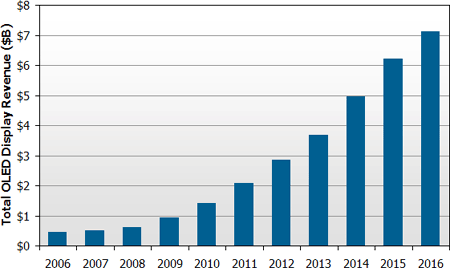 根據DisplaySearch 第二季OLED(有機發光二極管)出貨報告研究數據顯示,OLED市場節節攀升,2008年整體營收達到6億美元,預計到了2016年將大幅成長到71億美元,年復合成長率達36%。