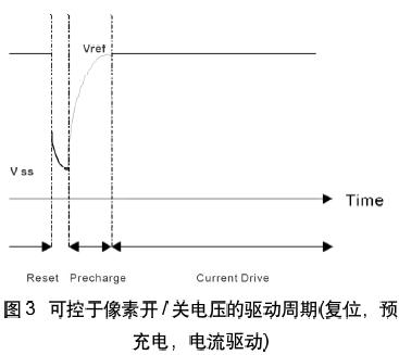 PMOLED彩色顯示要求的驅(qū)動機(jī)理和信號互換系統(tǒng)非常復(fù)雜。SSD1338的驅(qū)動器采用復(fù)用的尋址算法,每個(gè)驅(qū)動周期由放電(復(fù)位),電壓預(yù)充電和電流驅(qū)動三個(gè)階段組成(如圖3所示)。