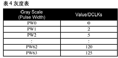 全彩顯示對每一個(gè)RGB原色分量提供6-bit,即64級灰度,通過電流驅(qū)動階段列驅(qū)動的脈寬調(diào)制(PWM)設(shè)置不同的灰度級。灰度表即為存儲了對應(yīng)64級灰度(GS0~GS63)的PWM(PW0~PW63)的值。脈寬越寬,象素顯示越亮。因此,每個(gè)象素的顯示亮度由灰度表中的脈寬值決定。