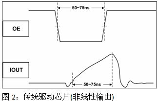 以下為臺灣迅杰科技推出包含SnapDriveTM技術之驅動芯片測試條件及結果,藉圖1及圖3可以明顯看出其驅動芯片在極小的OE脈沖寬度下其輸出電流仍為線性輸出,而傳統驅動芯片則無法提供線性的輸出。
