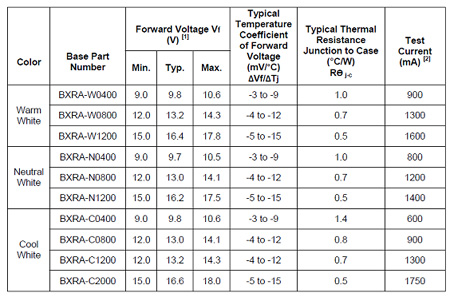 假定對LED以Io恒流供電,在結溫為T1時,電壓為V1,而當結溫升高為T2時,整個伏安特性左移,電流Io不變,電壓變為V2。這兩個電壓差被溫度去除,就可以得到其溫度系數,以mV/oC表示。對于普通硅二極管,這個溫度系數大約為-2mV/oC。但是LED大多數不是用硅材料制成的,所以它的溫度系數也要另外去測定。幸好各家LED廠家的數據表中大多給出了它的溫度系數。例如對于Cree公司的XLamp7090XR-E大功率LED,其溫度系數為-4mV/oC。要比普通硅二極管大2倍。至于美國普瑞的陣列LED(BXRA)就給出了更為詳細的數據。
