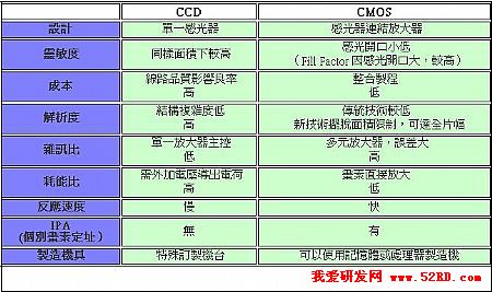 CCD與CMOS電路結構之完整比較(摘錄自SHARP月刊)差異分析整體來說,CCD與CMOS兩種設計的應用,反應在成像效果上,形成包括ISO感光度、制造成本、解析度、雜訊與耗電量等,不同類型的差異:ISO感光度差異:由于CMOS每個畫素包含了放大器與A/D轉換電路,過多的額外設備壓縮單一畫素的感光區域的表面積,因此在相同畫素下,同樣大小之感光器尺寸,CMOS的感光度會低于CCD。