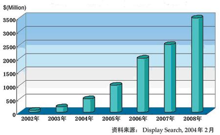 根據全球權威平板顯示器(FPD)市場調研和咨詢機構DisplaySearch在2004年12月的最新統計(見表2),OLED行業2004年全年總收入為3.28億美元,比2003年增長了41%。上圖為DisplaySearch2004年2月對全球OLED市場的預測。