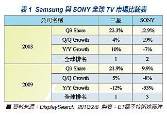 根據(jù)DisplaySearch研究指出,2009第三季全球電視品牌出貨金額排名與市佔率,三星皆為第一名,遠勝暫居第三的SONY(見圖一),但是就三星現(xiàn)階段的作法來看,三星似乎不滿足,對於OLED TV與3DTV等產(chǎn)品線,三星集團早已極積佈局。而就2010的CES展來看,三星推出65吋的3DTV,其中內建3D處理器,可將2D內容轉換成3D,同時,三星也會推出藍光播放機,同時支援3D內容播放。