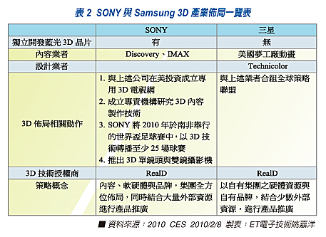 然而,消費者要的不是一臺高科技電視,更要豐富的閱聽內容。以3D影像產(chǎn)業(yè)而言,除了需要強大硬體裝置支援外,其豐富的3D內容支援也是相當重要的。09年的CES展,許多大廠開始拉攏平臺與內容業(yè)者一同站臺,因為他們知道光是只有硬體不能讓消費者買單,多元的加值服務才是消費性電子未來的趨勢。2010年的CES展,同樣也是依循前年的模式,而且力道更加強勁,以補強各自提出自有的硬體解決方案。另一方面,以SONY與三星來說,兩家公司同時都與RealD技術合作以獲取3D的專利技術,以避免專利侵權的問題發(fā)生,就以產(chǎn)業(yè)現(xiàn)況來看,頗有烘抬3D產(chǎn)業(yè)的味道(見表二)。