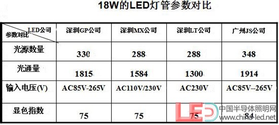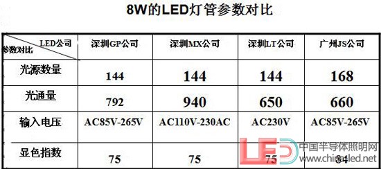 通過上面的表格可以看出,以上我們任意選擇的四家公司的LED燈管的相關結果數據有的參數會有會有一定的差別,選用LED光源的數量從144-168顆,光通量也從650-940LM,相差的范圍有290LM之多,輸入的電壓有寬電壓,也有窄電壓。顯色指數基本在Ra=75左右,國家LED燈具標準出臺后會有一個標準和規范。以上為各廠家自行測試結果(如上圖所示)