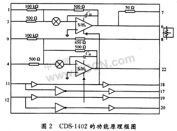 在CCD的應(yīng)用領(lǐng)域中。相關(guān)雙采樣電路得到了廣泛的應(yīng)用。很多公司專門研發(fā)了相關(guān)雙采樣的集成電路芯片。這些專用芯片不僅使用方便,且性能也能得到很大的提高。CDS1402芯片是一種典型的相關(guān)雙采樣電路芯片,它是專門為CCD成像器件研制的,用來(lái)消除復(fù)位噪聲。CDS1402進(jìn)行了優(yōu)化,適合用于10~14位轉(zhuǎn)換精度的數(shù)字視頻。低噪聲的CDS1402芯片也是利用對(duì)高低電平信號(hào)的采樣并相減來(lái)精確確定視屏信號(hào)的。結(jié)果在CCD輸出的浮動(dòng)電容器上,那些剩余電荷和kTC噪聲被最大限度的消除。CDS1402芯片一共有24個(gè)引腳。它包含有2個(gè)獨(dú)立的采樣保持放大器和S/H電路,每個(gè)S/H電路都有獨(dú)立的控制線,輸人和輸出管腳,有兩個(gè)管腳提供偏置調(diào)流和調(diào)壓。一般來(lái)說(shuō),CCD的輸出信號(hào)都要連接到2個(gè)S/H的輸入端,S/H1端用來(lái)采集和保持偏置信號(hào),它的輸出值與CCD輸出信號(hào)相減,當(dāng)CCD輸出偏置+視頻信號(hào)的時(shí)候,S/H2端就進(jìn)入信號(hào)的采集狀態(tài),從而獲得有用的視頻信號(hào)。