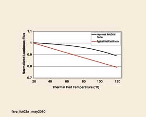 目前,市場上的一些高功率LED的熱/冷因數(shù)為0.94。這意味著LED在100℃條件下工作時,將失去6%的標(biāo)準(zhǔn)光通。圖2給出了典型和改進(jìn)的熱/冷因數(shù)下的光輸出降低函數(shù)。