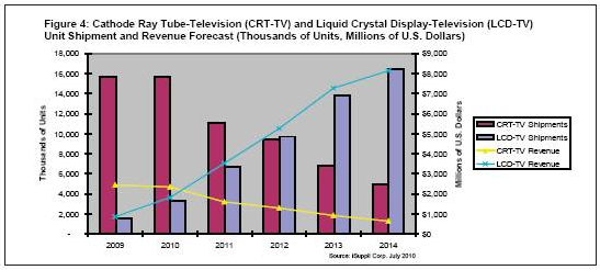 總體來看,CRT電視銷售額在2011年將降至16億美元,比2010年的23億美元減少32.3%。相比之下,液晶電視銷售額2011年將增長到35億美元,比2010年的18億美元大增94.3%。