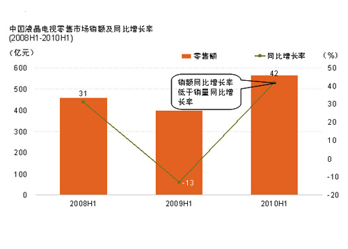 根據(jù)捷孚凱(GfK 中國)全國液晶電視零售推算數(shù)據(jù),2010年上半年液晶電視市場整體規(guī)模為1517萬臺,同比2009年上半年規(guī)模增長55.2%,而銷售額同比增長42%。上半年度整體彩電市場規(guī)模為1863萬臺,液晶電視在整個彩電市場中的占比已經(jīng)達到82%。