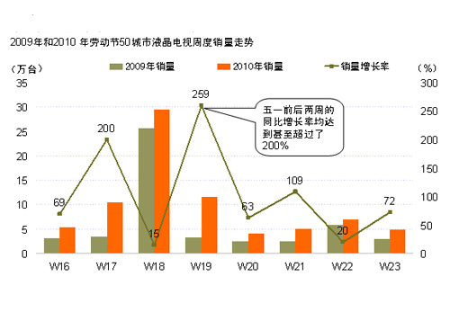 究其原因,其實與我們之前分析的上半年市場的變革不無關系。今年五一是LED電視第一次大規(guī)模上市,各廠商都試圖在這場前哨戰(zhàn)中拔得頭籌,均不遺余力地提前進行宣傳造勢;而諸如國美、蘇寧等幾家大型連鎖零售商也推波助瀾,比以往更早、更多地投入資源展開宣傳攻勢。事實證明,媒體攻勢是有效地。顧客提前兩周就已紛紛步入商場,而大量的新店開業(yè)活動和老店重裝慶典,加上五一本身就有的節(jié)日促銷活動,使不少消費者放心地在節(jié)前就買單回家享受擁有平板電視的生活。
