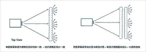 (UCS/RUCS屏幕)在兩層透鏡之間的光學鏡頭表面覆蓋了一層黑色素層,可吸收環境光,柱狀的鏡頭能拾取投影機的光線,并傳送到觀視者,而前面的環境光則會被吸收。