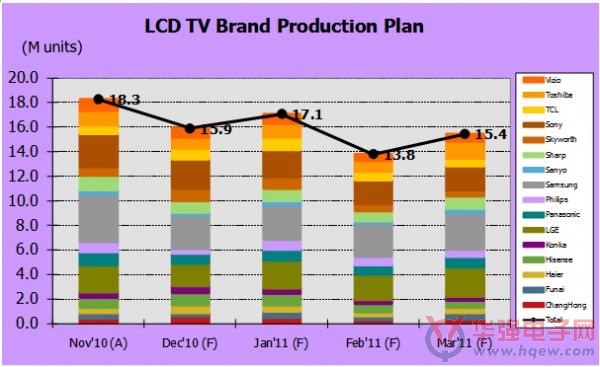 包括全球品牌三星和中國本土品牌康佳在內的前16家液晶電視品牌商每月生產(chǎn)總量已從2010年11月份的1千8百30萬臺降到了2011年3月份的1千5百40萬臺(如圖一)。同時,2011年第一季度生產(chǎn)總量預計為4千6百30萬臺,比2010年第四季度降低了12%。