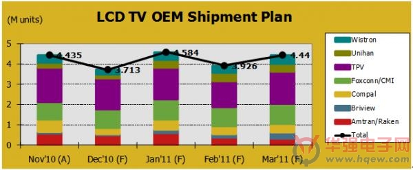 DisplaySearch顯示和電視研究總監(jiān)Debroah Yang表示,“許多地區(qū)市場環(huán)境不穩(wěn)定,從而導致電視需求量也不確定。盡管如此,第一季度的產(chǎn)品發(fā)布所預估的需求前景使一些品牌商增加了1月份的生產(chǎn)投入。”雖然電視品牌商對市場前景持謹慎態(tài)度,液晶電視代工廠商(OEM/ODM)卻在2010年12月份到2011年3月份期間持續(xù)增加每月出貨計劃。這個現(xiàn)象表明電視品牌商正在逐步增加生產(chǎn)外包到OEM/ODM廠商。而這主要是基于成本控管和生產(chǎn)規(guī)模的考慮。此外有些品牌商為了獲取所需的面板供應也會增加釋單比率。