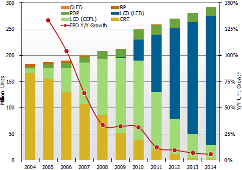- 預(yù)計總體液晶電視出貨量將穩(wěn)步增長,到2014年達到2.7億臺