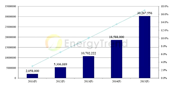 - 預(yù)估微型逆變器的滲透率在2011年可提升至3%,在2015年可達(dá)15%~20%