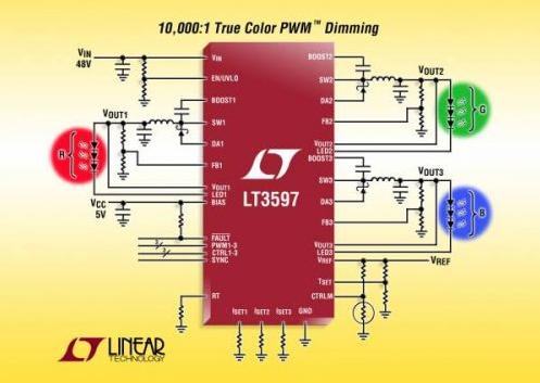 LT3597 采用 3 個獨立的 400mA、60V 內部開關,以提供降壓型恒定電流源。內部降壓型轉換器運用自適應反饋環路調節輸出電壓,使其略高于所需要的 LED 電壓,以確保最高效率。如果任何一串 LED 串出現了開路或短路故障,那么 LT3597 就繼續調節其它 LED 串,并向 FAULT 引腳發出信號。其他特點包括基于節溫和 / 或 LED 溫度使 LED 電流降額以及在停機時斷接 LED。