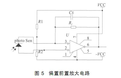 (1)由于運(yùn)算放大器是雙電源器件,通過合理的選擇偏置電阻使光電轉(zhuǎn)換前置放大電路的輸出電壓達(dá)到合適的幅值(即設(shè)置適當(dāng)?shù)撵o態(tài)工作點(diǎn)) , 以獲得最大的電壓擺幅, 避免飽和失真。 如圖 6 電路所示,電壓輸出設(shè)置于- 4 V 左右, 避免因強(qiáng)烈的環(huán)境光造成的飽和失真。