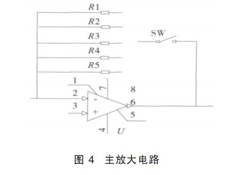 由仿真結(jié)果可以看出光電二極管產(chǎn)生的微安級(jí)的弱光電流經(jīng)前置放大電路可輸出毫伏級(jí)的電壓,所以仍需通過主放大電路進(jìn)行后續(xù)處理。 主放大電路如圖 4 所示; R 1~ R 5 電阻可實(shí)現(xiàn)電壓放大倍數(shù)的多檔可調(diào),即所謂的靈敏度調(diào)節(jié)。