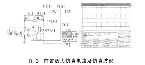 (2)設(shè)計(jì)合理的通頻帶; 通過電容 Cs 與反饋電阻Rf 的并聯(lián), 構(gòu)成低通濾波電路,其上限截止頻率為1/ 2%:Cs:Rf 。上限截止頻率越小,信號(hào)輸出信噪比越好;但較小的上限截止頻率會(huì)使信號(hào)產(chǎn)生頻率失真,具體使用時(shí)要根據(jù)實(shí)際情況調(diào)試而定;